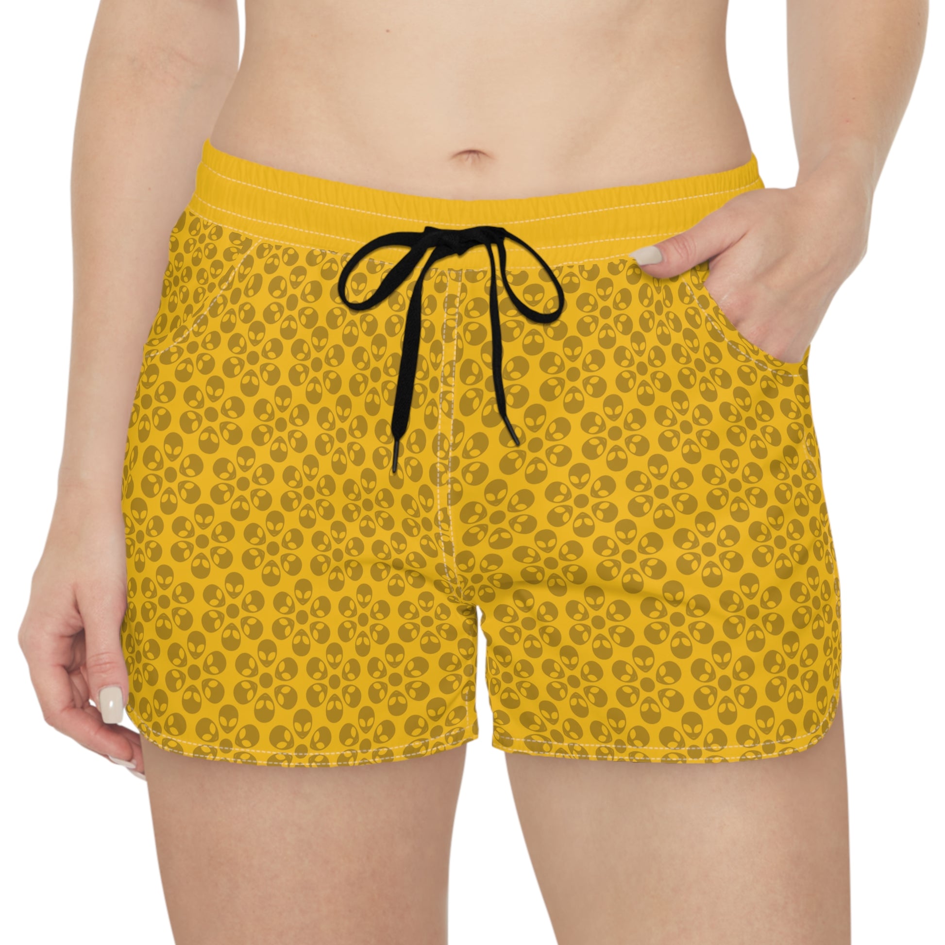 Casual Alien Print Shorts for Women Fashionable Summer Loungewear Perfect for Lounging Yoga Beach Summer Vacations Gifts Alien Flowers Yellow