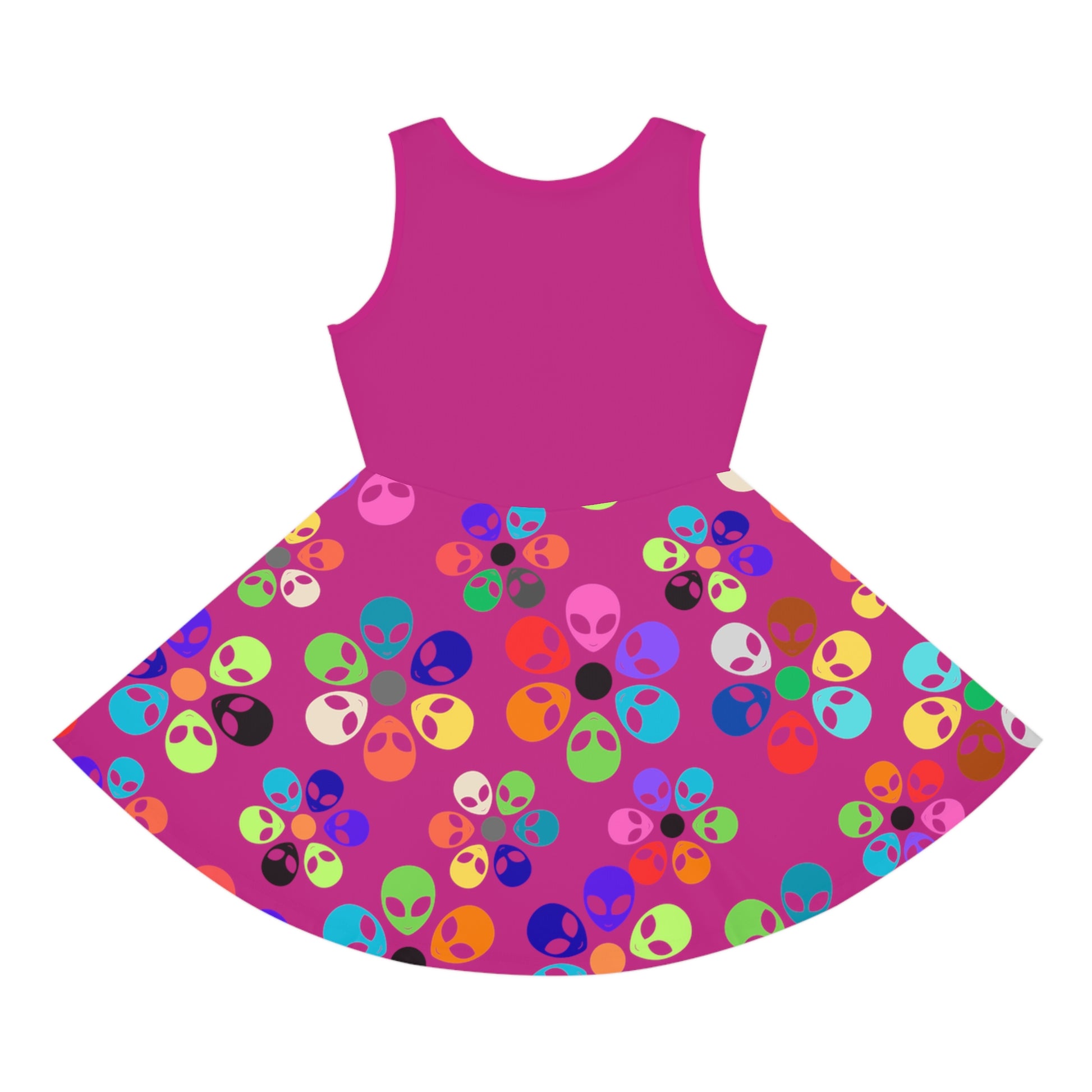 Colorful Alien Print Girls Sundress Summer Dress Kids Fashion Birthday Outfit Playful Dress Unique Gifts for Girls Alien Rainbow Flowers Pink