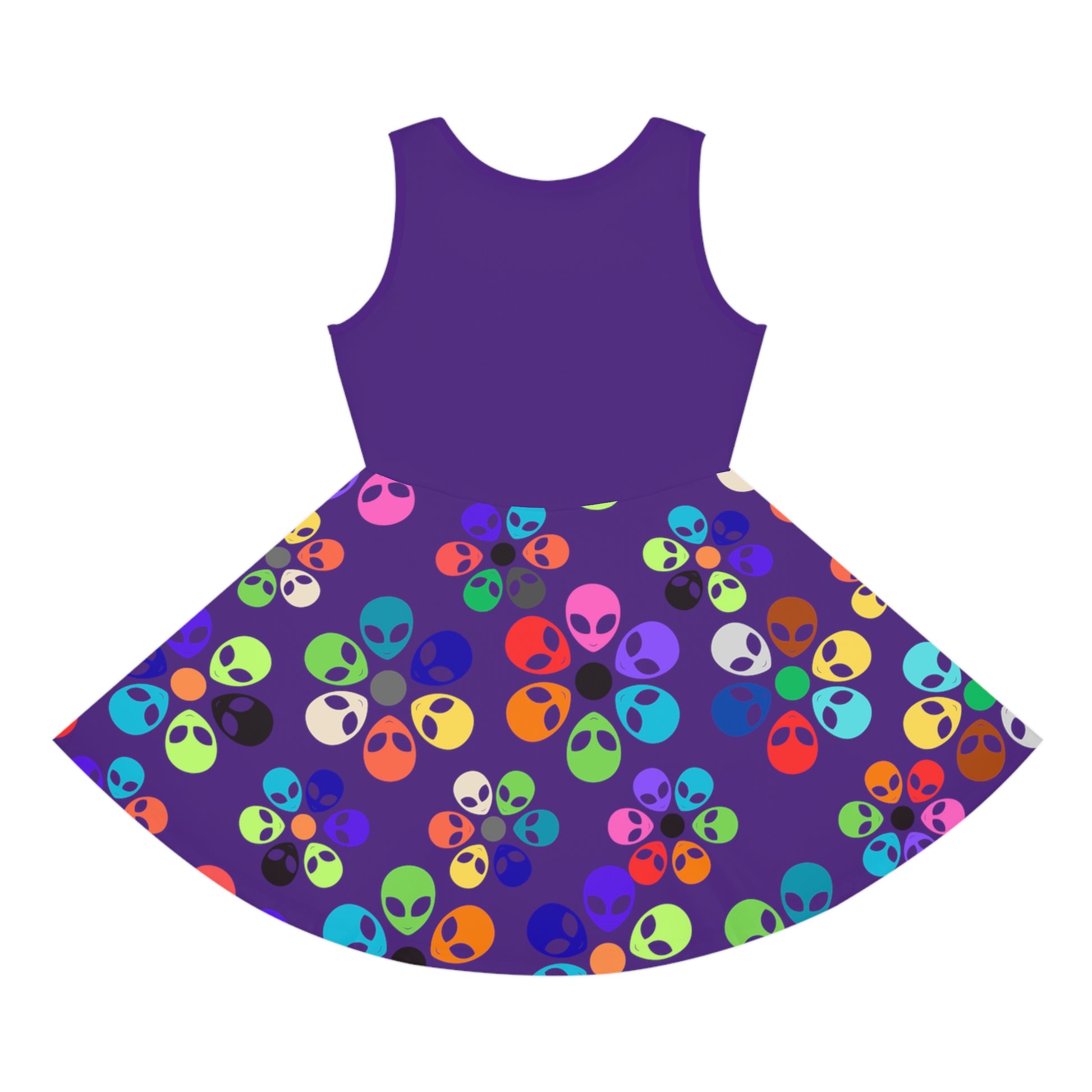 Colorful Alien Print Girls Sundress Summer Dress Kids Fashion Birthday Outfit Playful Dress Unique Gifts for Girls Alien Rainbow Flowers Purple