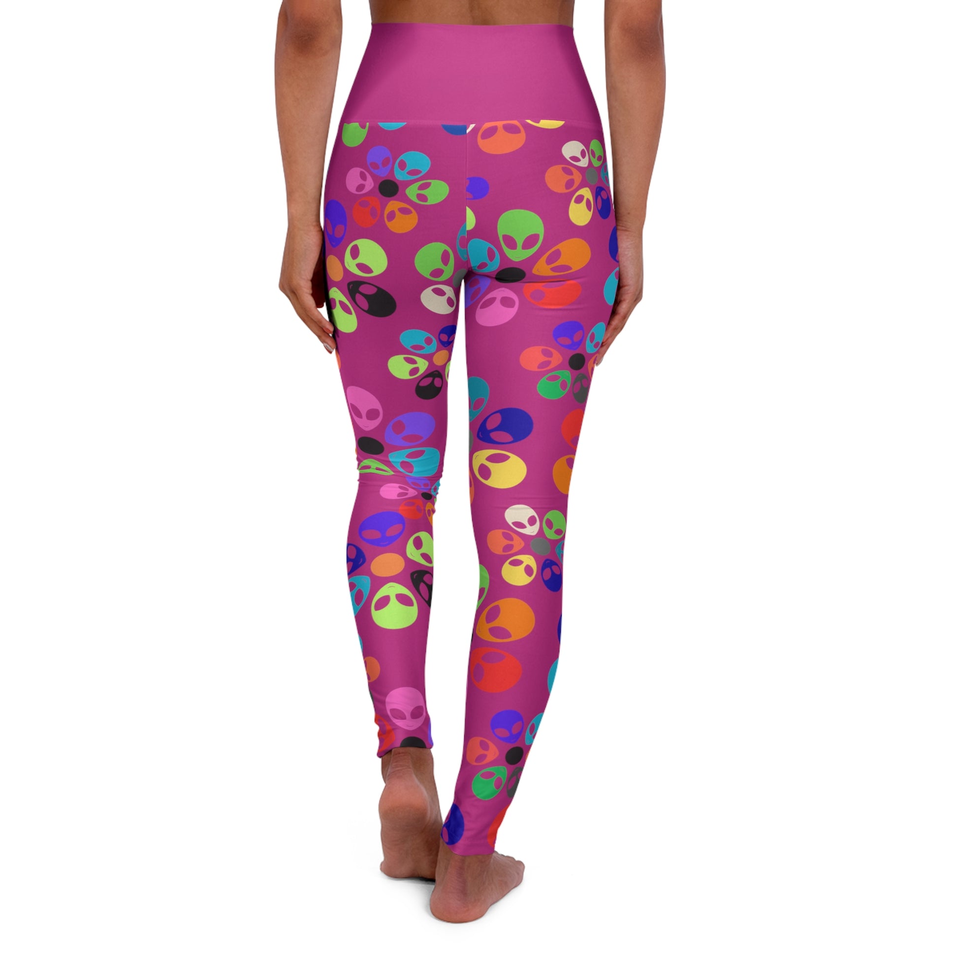 Colorful Alien Print High Waisted Yoga Leggings | Unique Workout Leggings Fitness Apparel Activewear Gifts for Yogis Alien Rainbow Flowers Pink