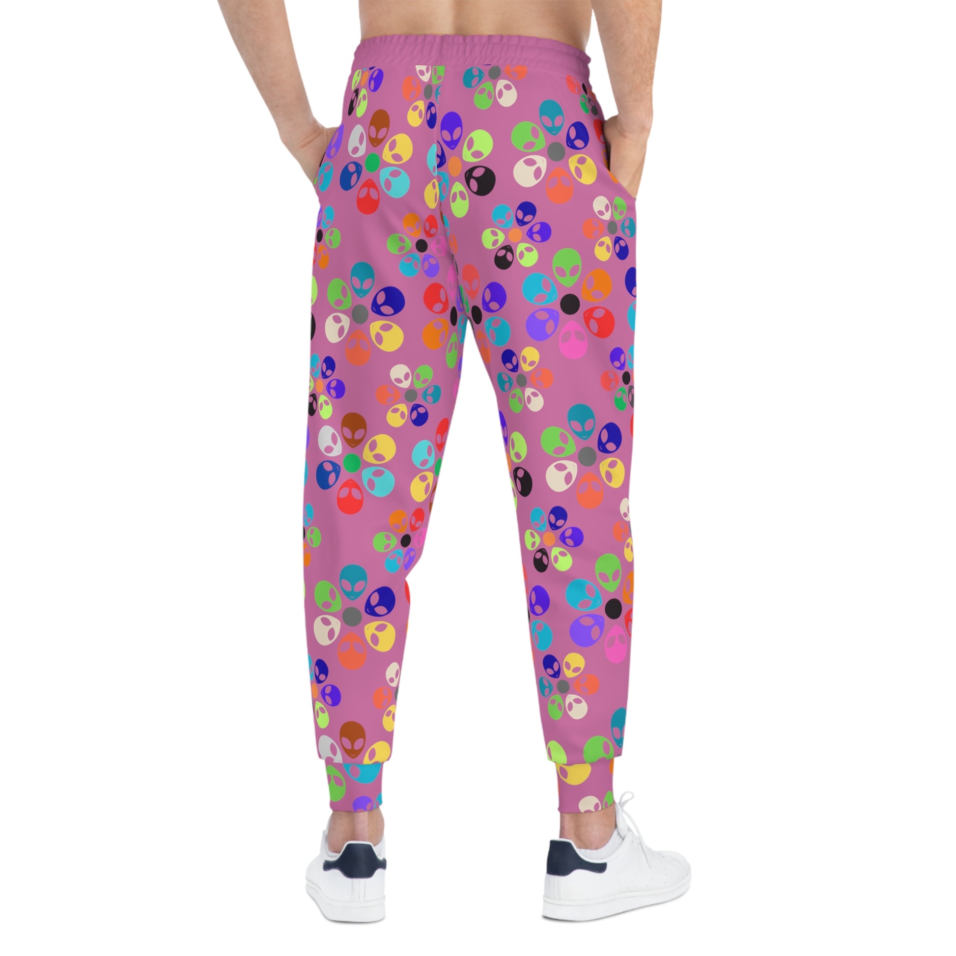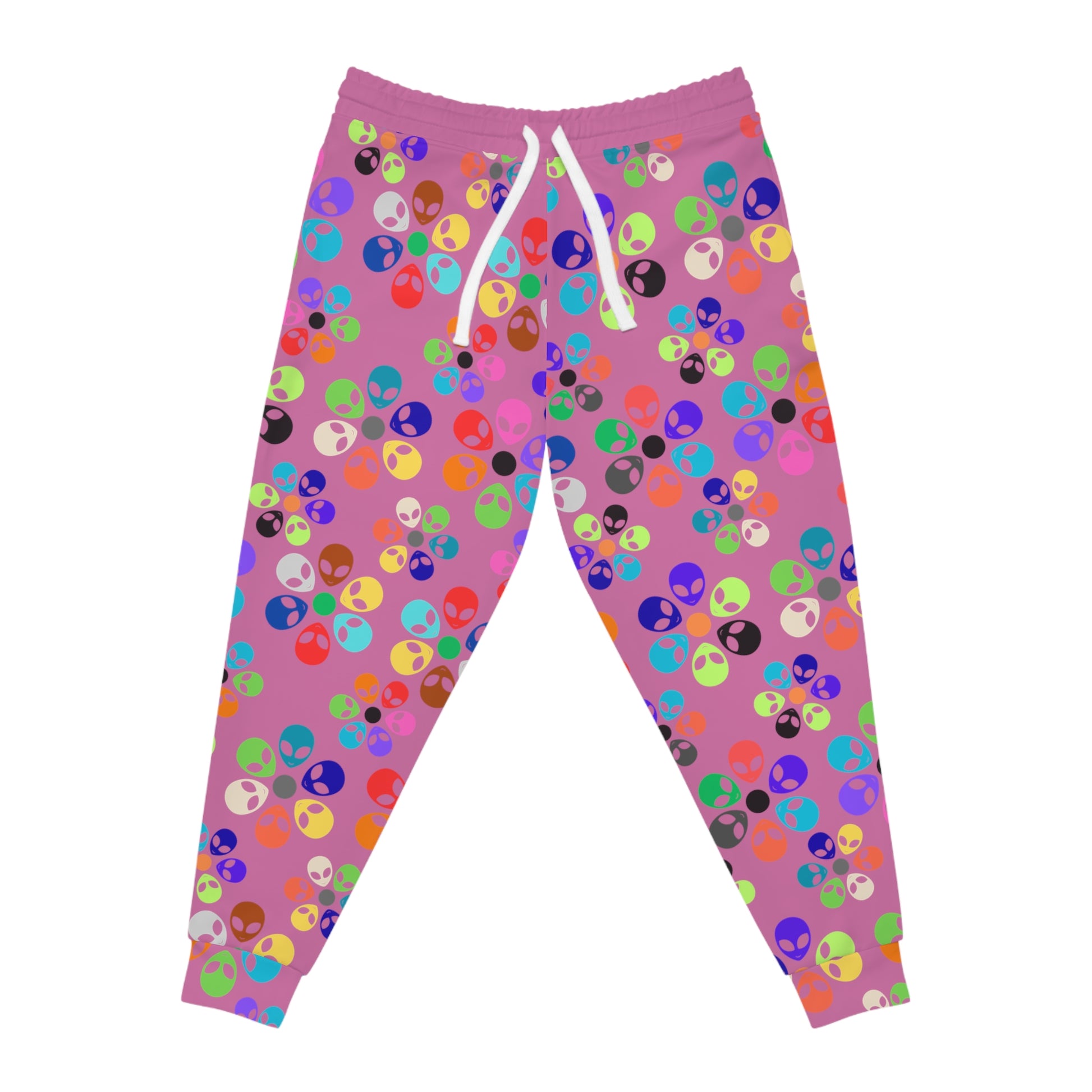 Colorful Alien Print Joggers Fun Athletic Pants Trendy Loungewear Unique Gift for Space Lovers Casual Daily Wear Unisex Joggers Alien Rainbow Flowers Light Pink