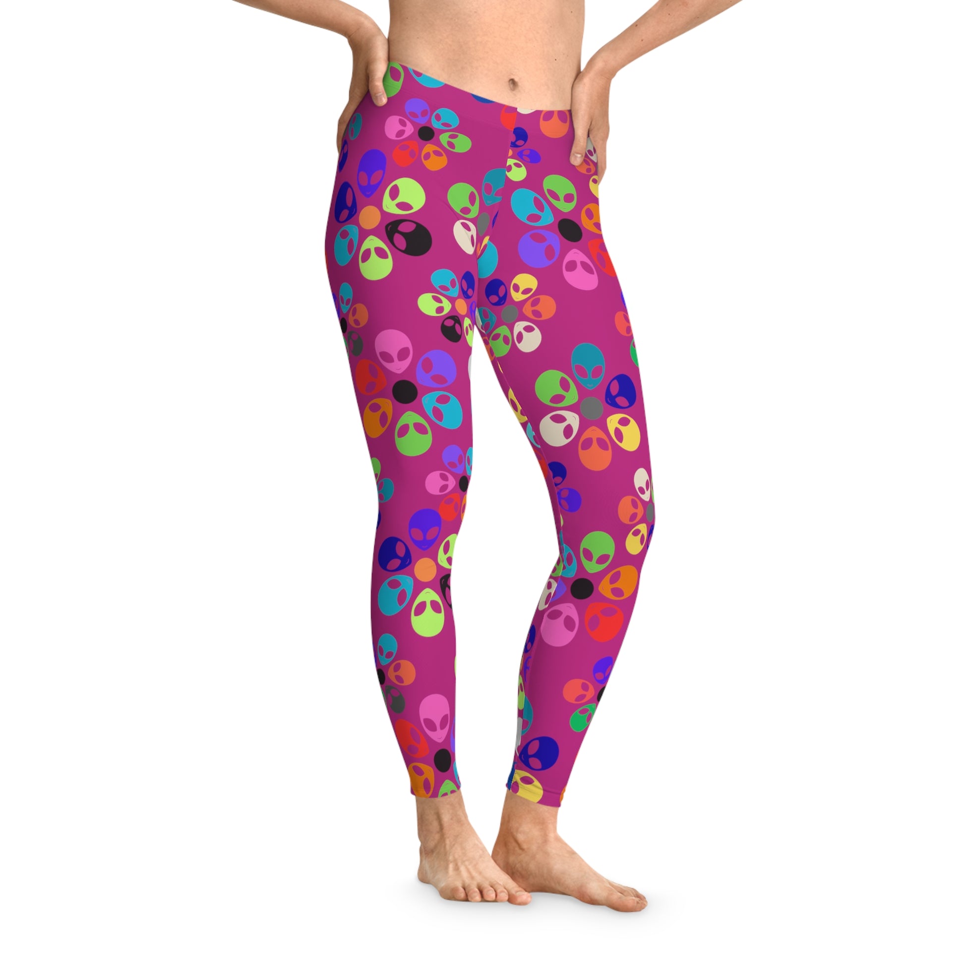 Introducing these vibrant ankle-length leggings, perfect for those who love to express their unique style. With an all-over, eye-catching print featuring colorful alien faces, these leggings are sure to make you stand out in any crowd. They offer a perfect blend of comfort and flair, ideal for casual outings, yoga sessions, or lounging at home. The stretchy material molds to your figure, providing unrestricted movement while keeping you fashion-forward. Whether you're dressing up for a fun night out, celebrating Halloween, or just want to add some playful vibes to your wardrobe, these leggings are the perfect choice for anyone who adores quirky fashion. Great for women who love to keep their style both chic and comfortable!