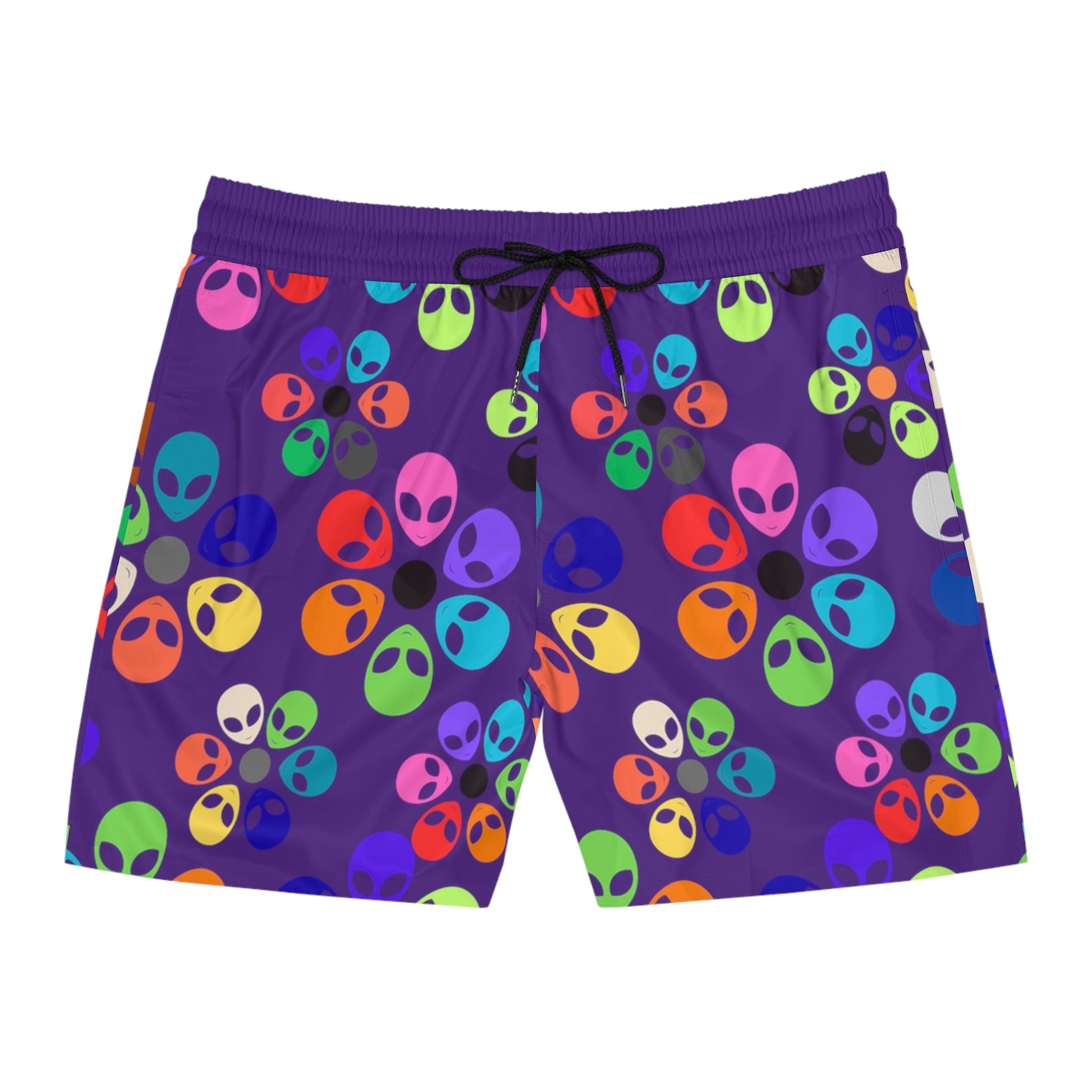 Colorful Alien Print Swim Shorts for Fun Summer Vibes Beachwear Pool Party Attire Vacation Essentials Mens Swimwear Alien Rainbow Flowers Purple