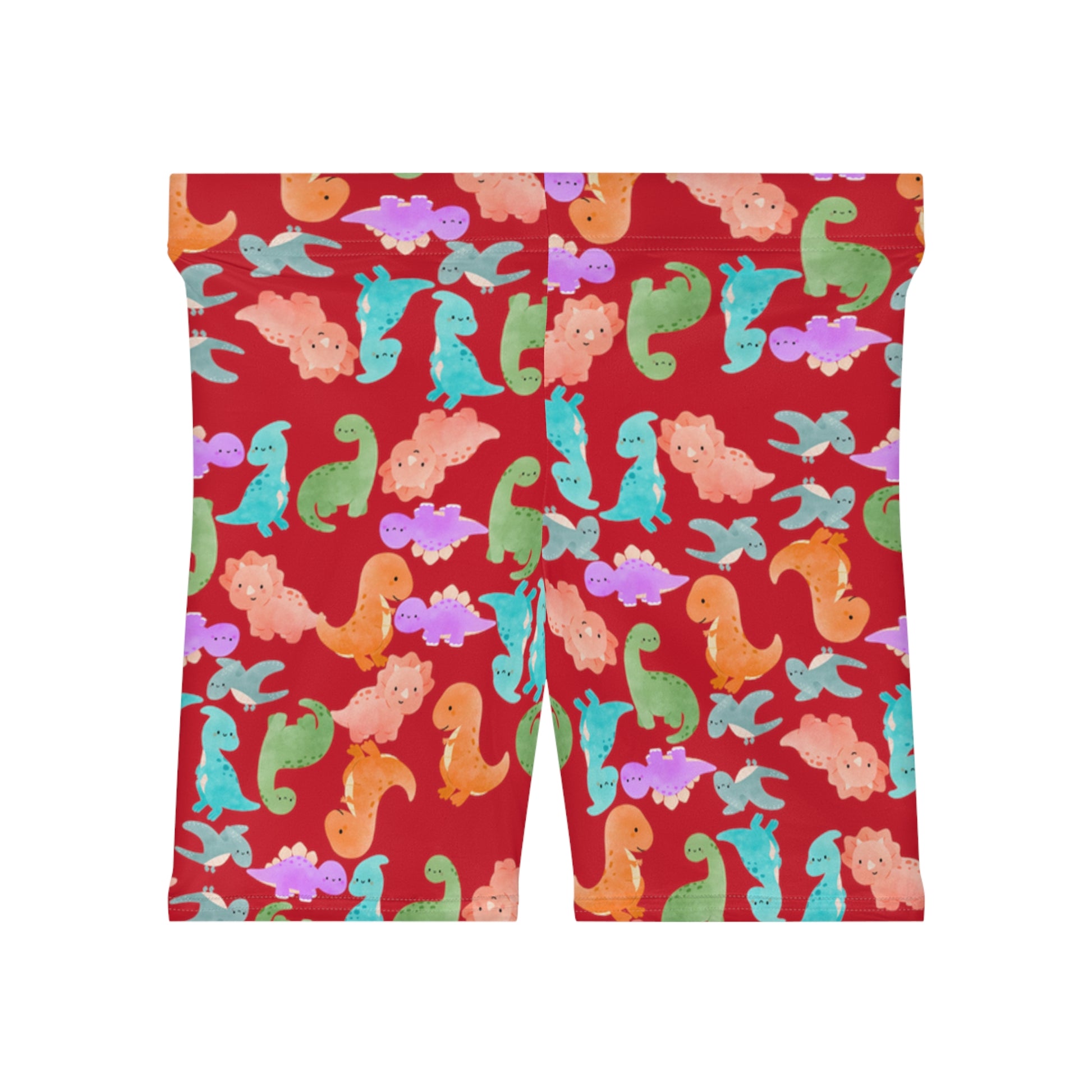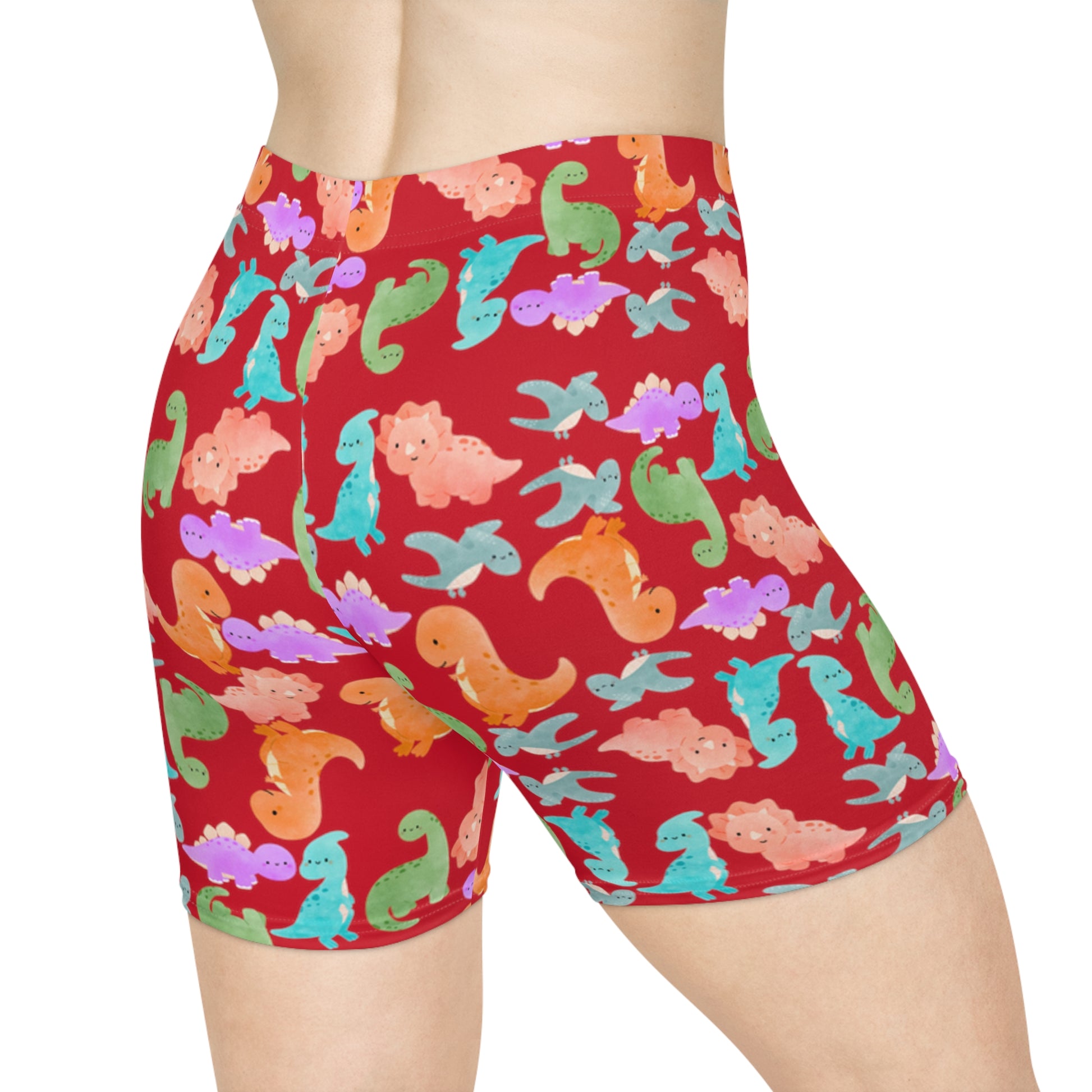 Colorful Dinosaur Womens Biker Shorts AOP Perfect for Casual Wear workout Summer Birthdays Playdates Unique Gift Rainbow Dinos Dark Red