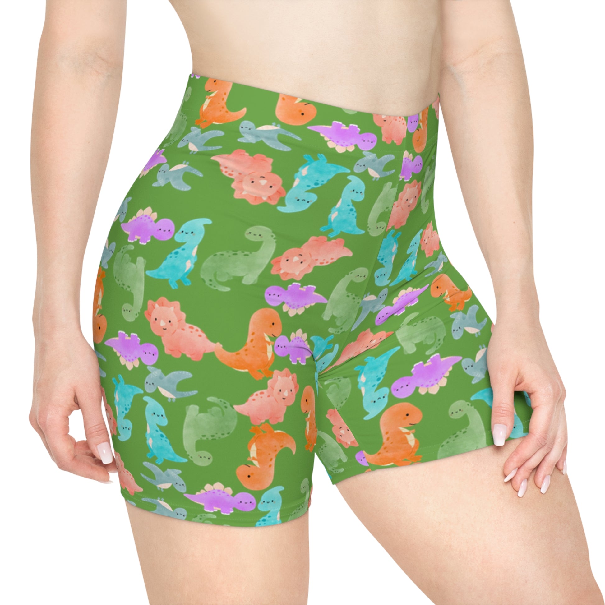 Colorful Dinosaur Womens Biker Shorts AOP Perfect for Casual Wear workout Summer Birthdays Playdates Unique Gift Rainbow Dinos Green