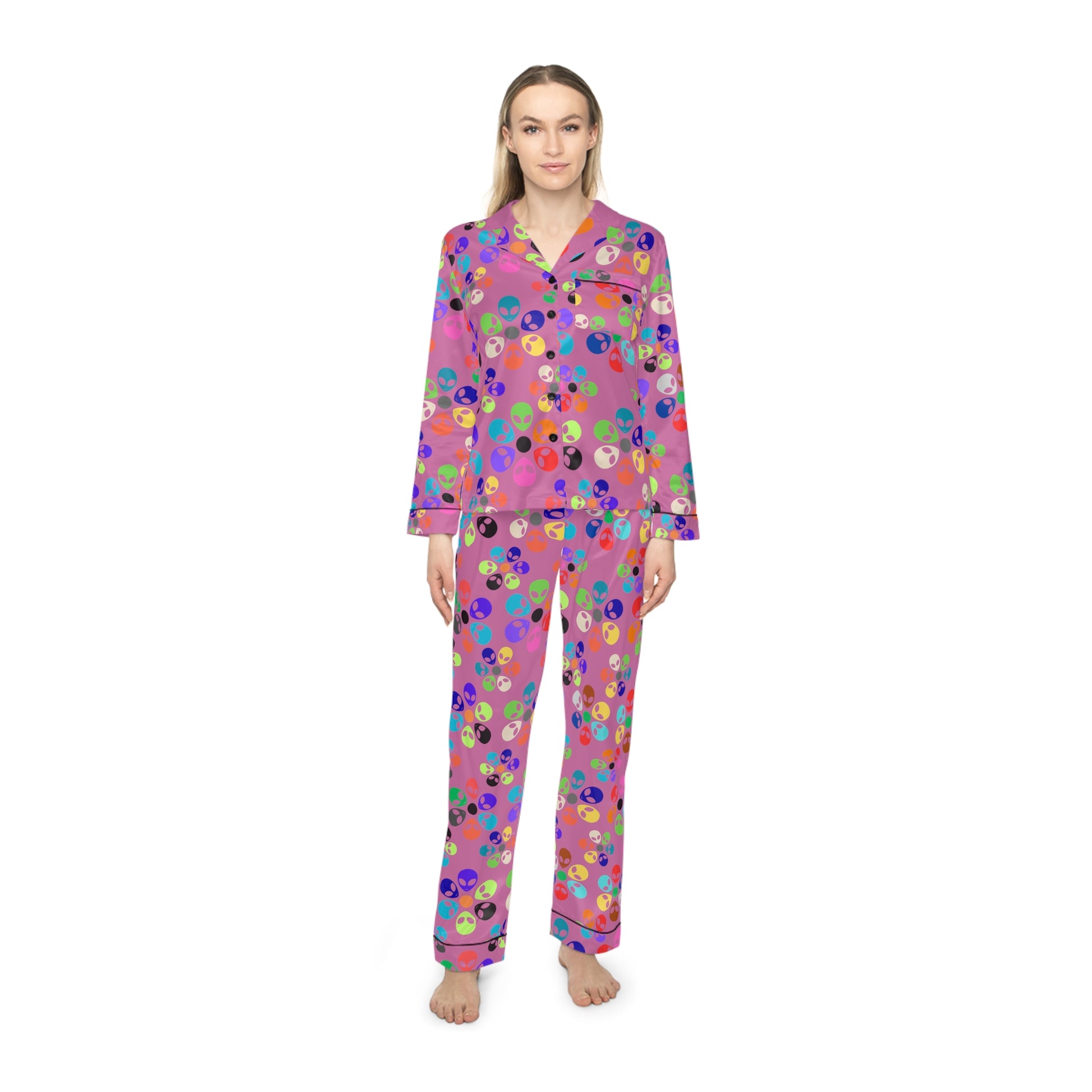 Colorful Womens Satin Pajamas Comfortable Sleepwear Set Cozy PJs for Women Vibrant Loungewear Cute Gift for Her Alien Rainbow Flowers Light Pink