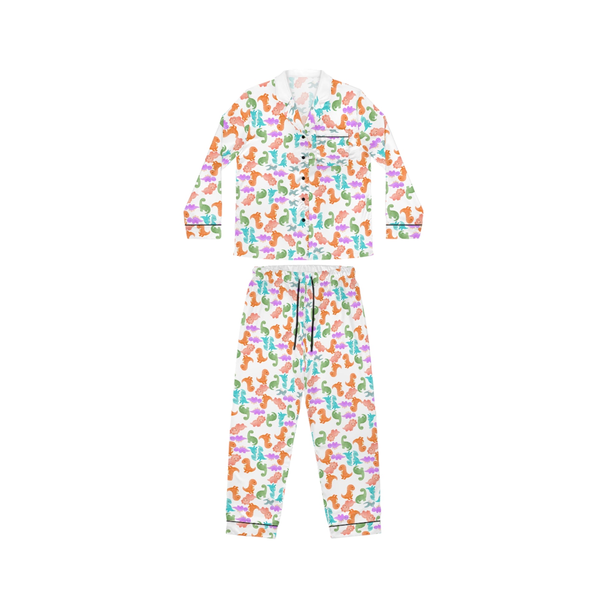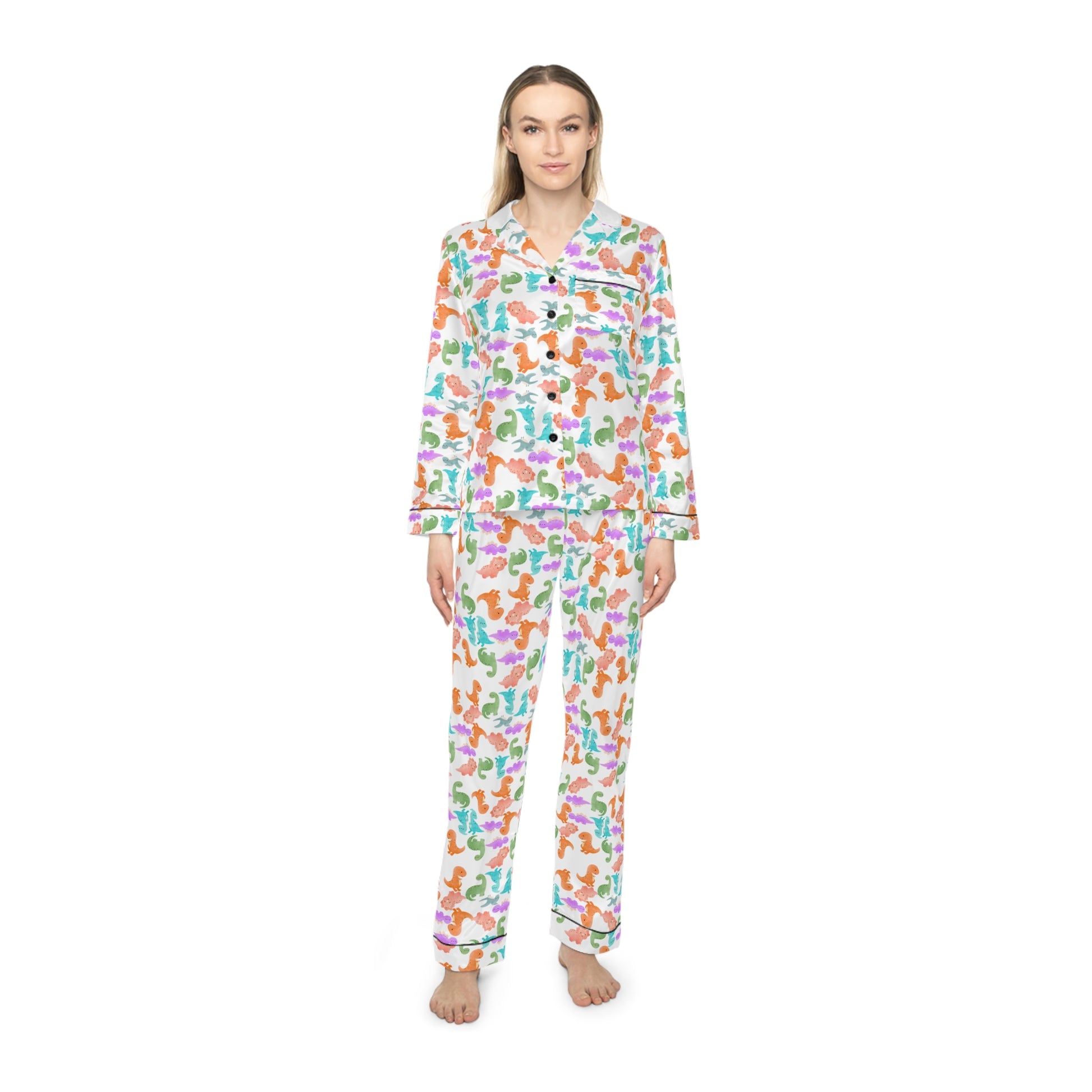 Colorful Womens Satin Pajamas Set Cozy Sleepwear Cute Loungewear for Celebrations Birthday Gift for Her Relaxation Clothing Rainbow Dinos Dark Red