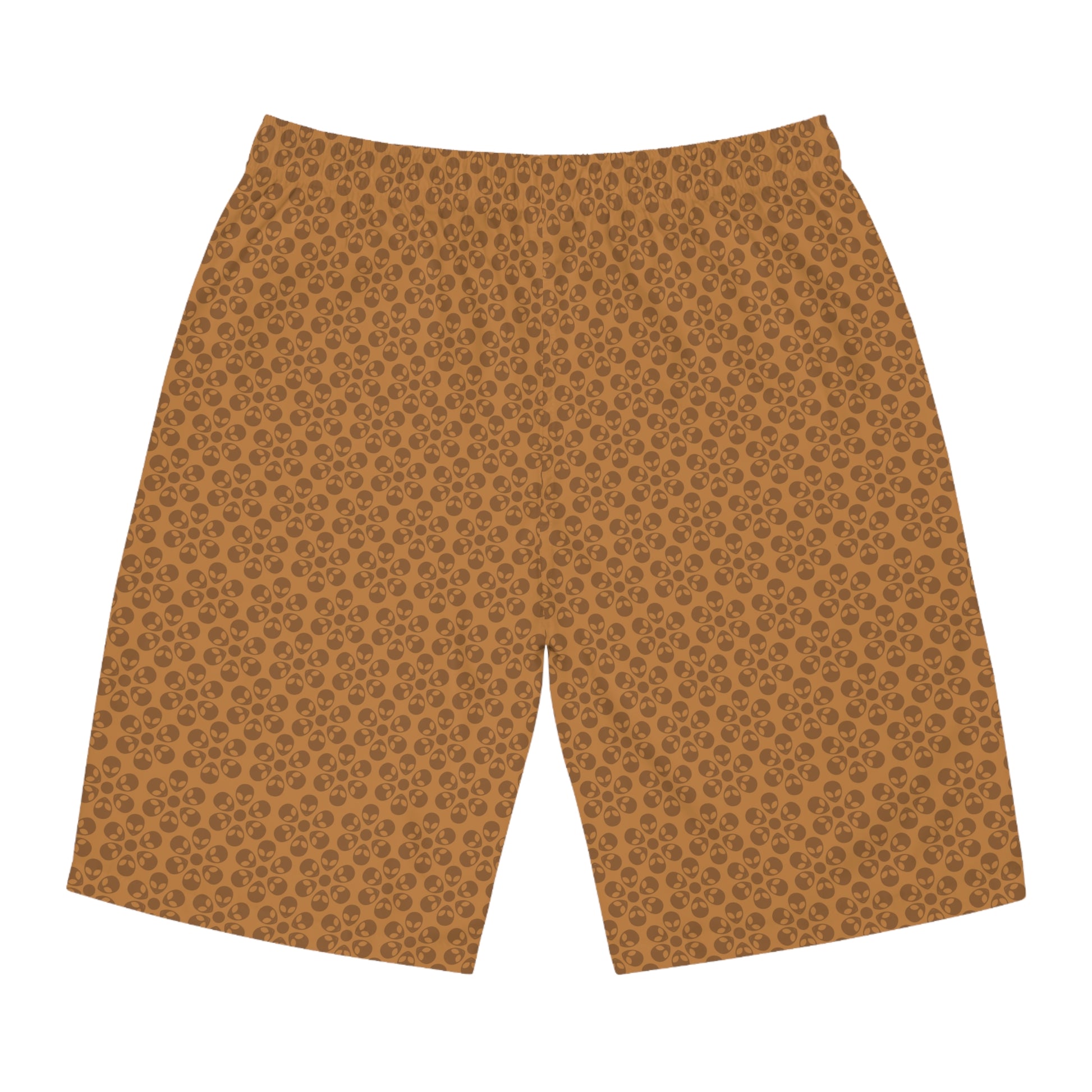 Mens Floral Print Board Shorts Summer Swimwear Beach Attire Vacation Ready Casual Everyday Shorts Alien Flowers Light Brown