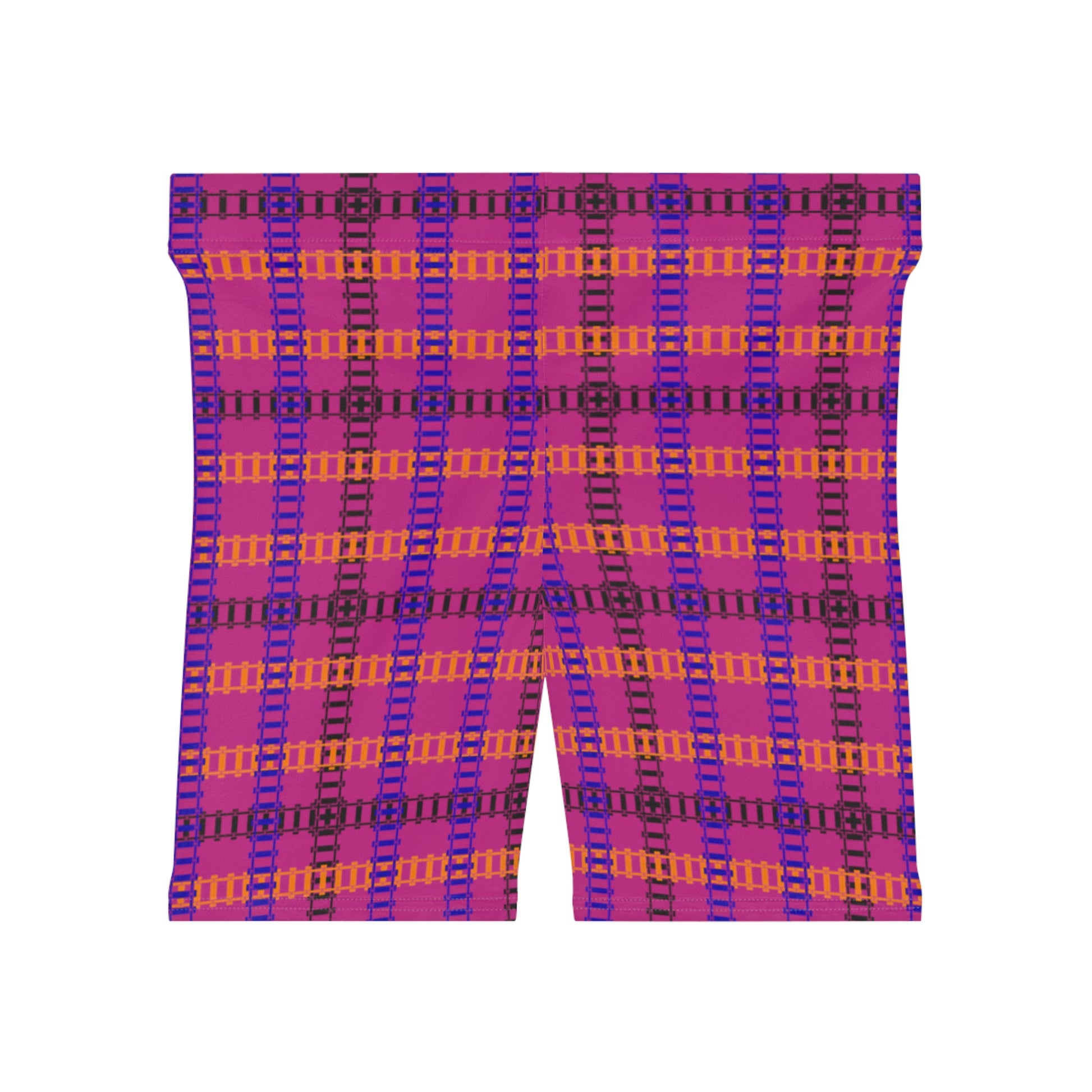 Stylish Womens Biker Shorts Plaid Pattern Comfortable Activewear Summer Essentials Workout Gear Casual Fashion Gift Idea Train Tracks Pink