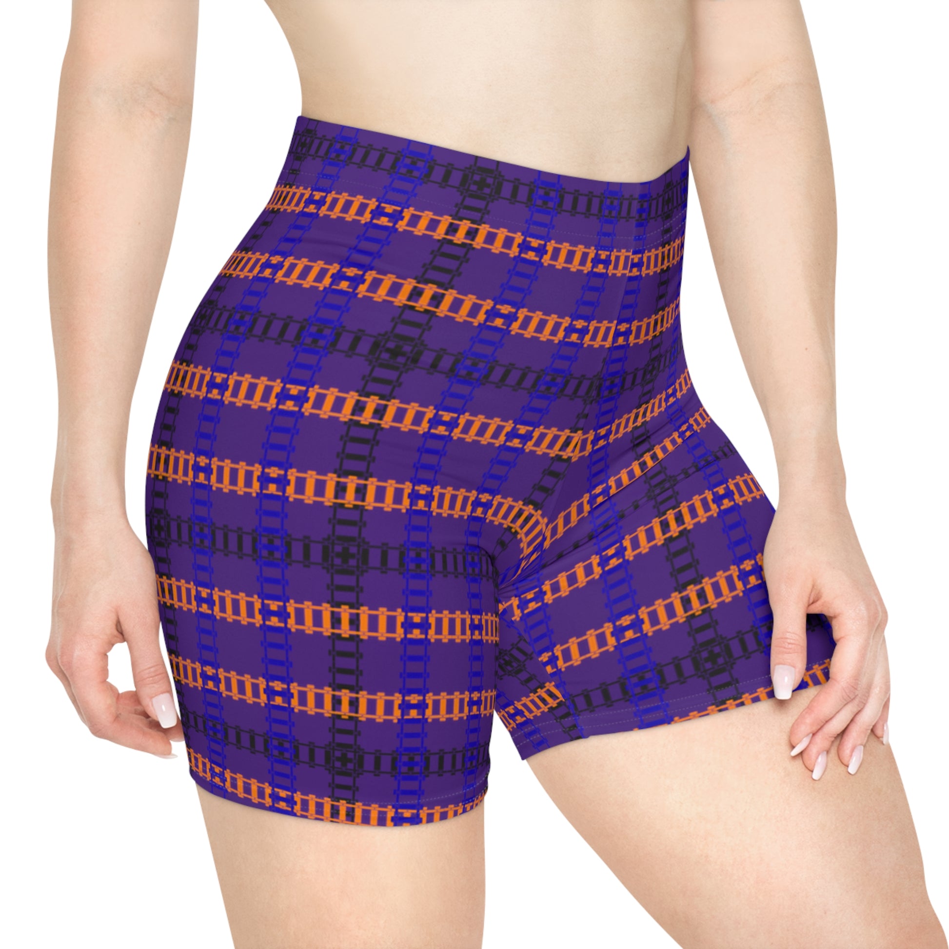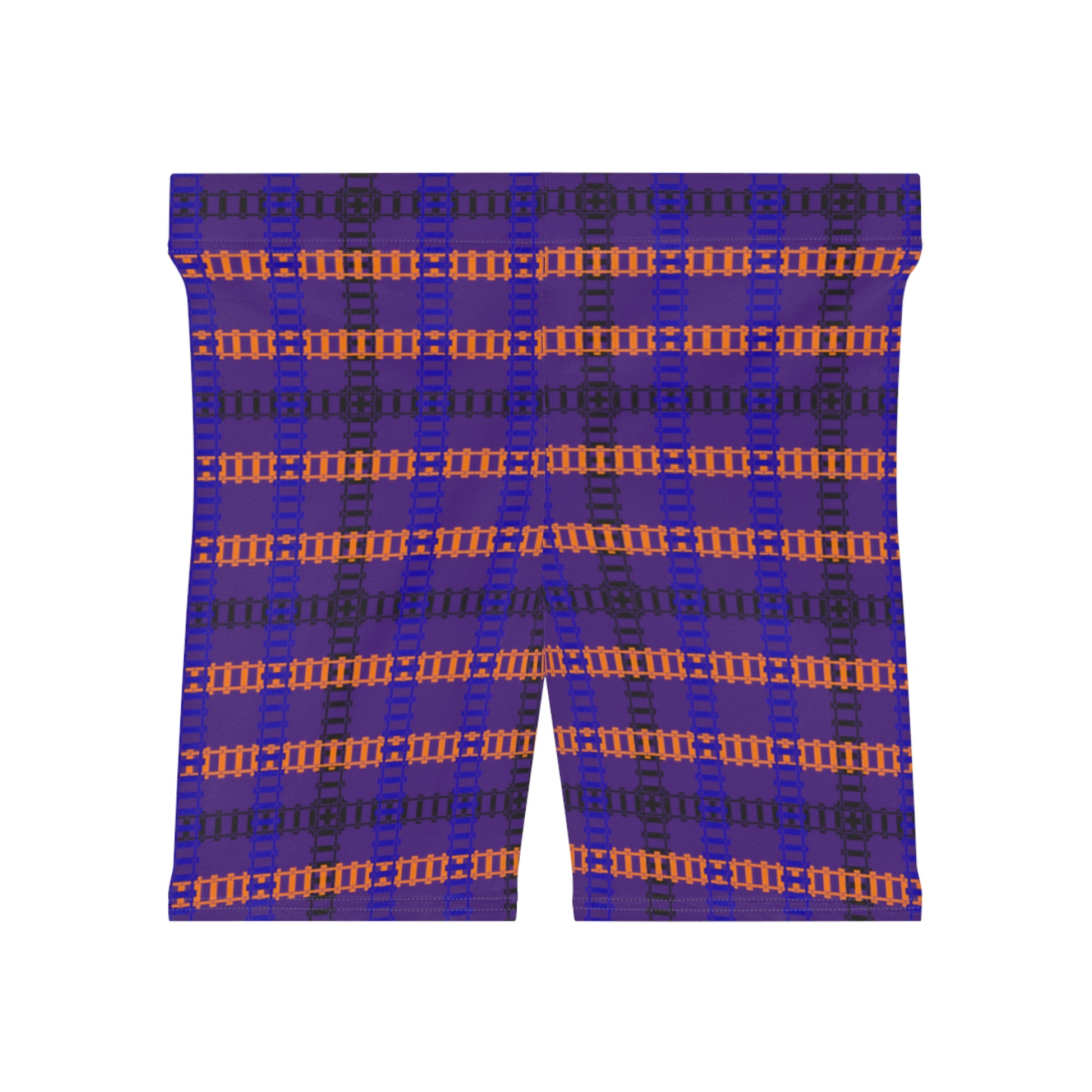 Stylish Womens Biker Shorts Plaid Pattern Comfortable Activewear Summer Essentials Workout Gear Casual Fashion Gift Idea Train Tracks Purple