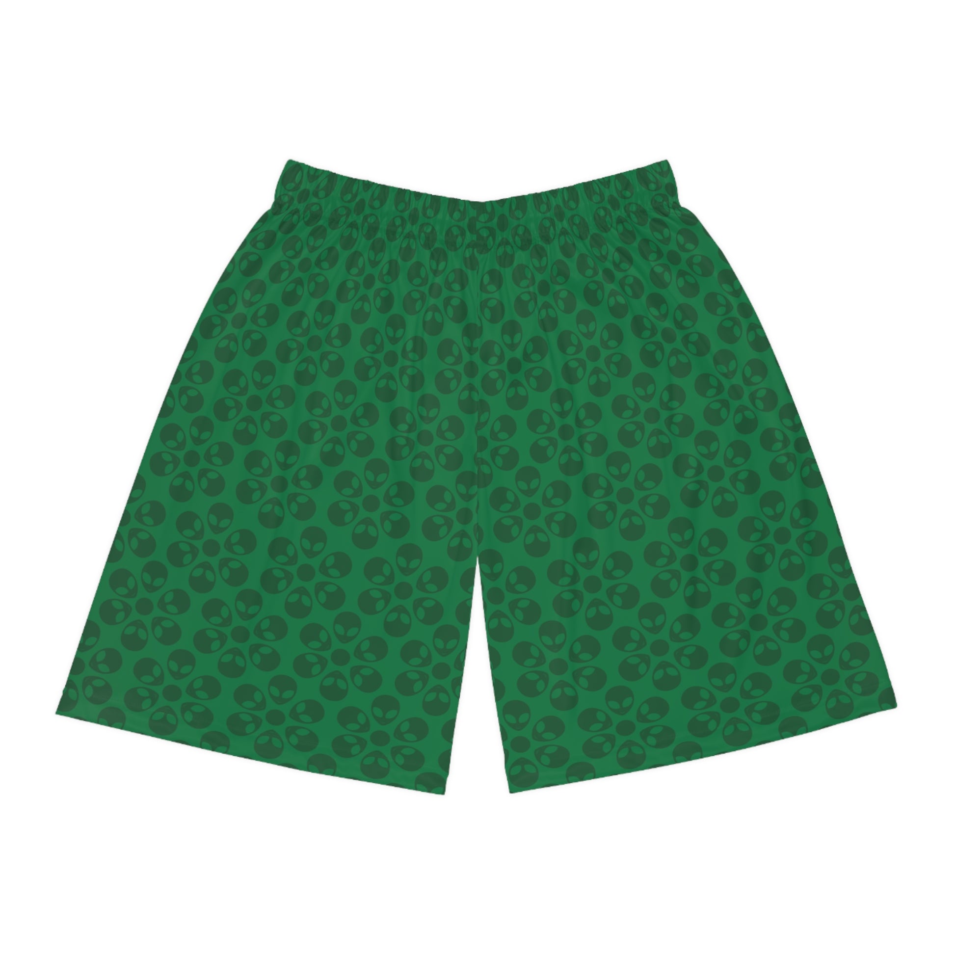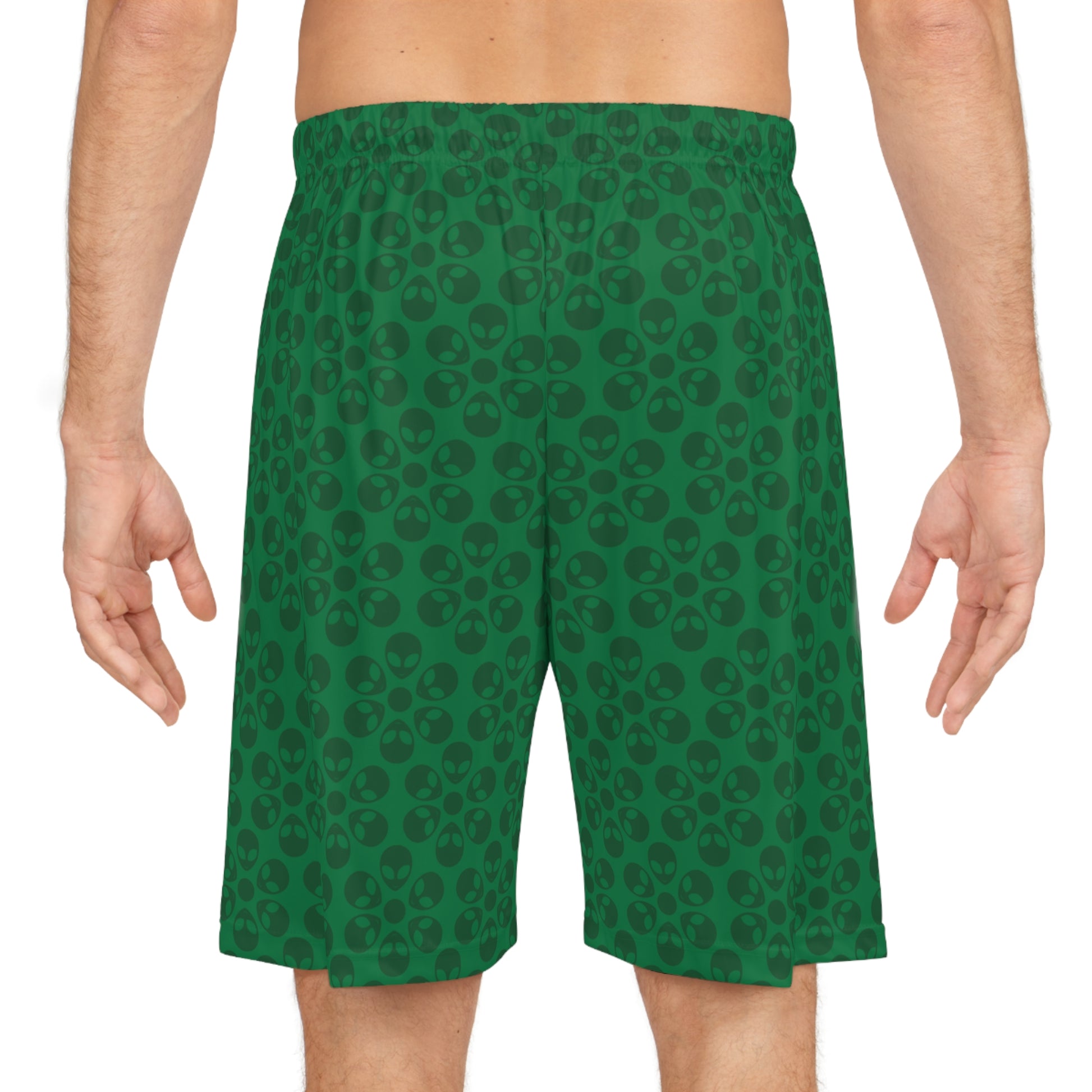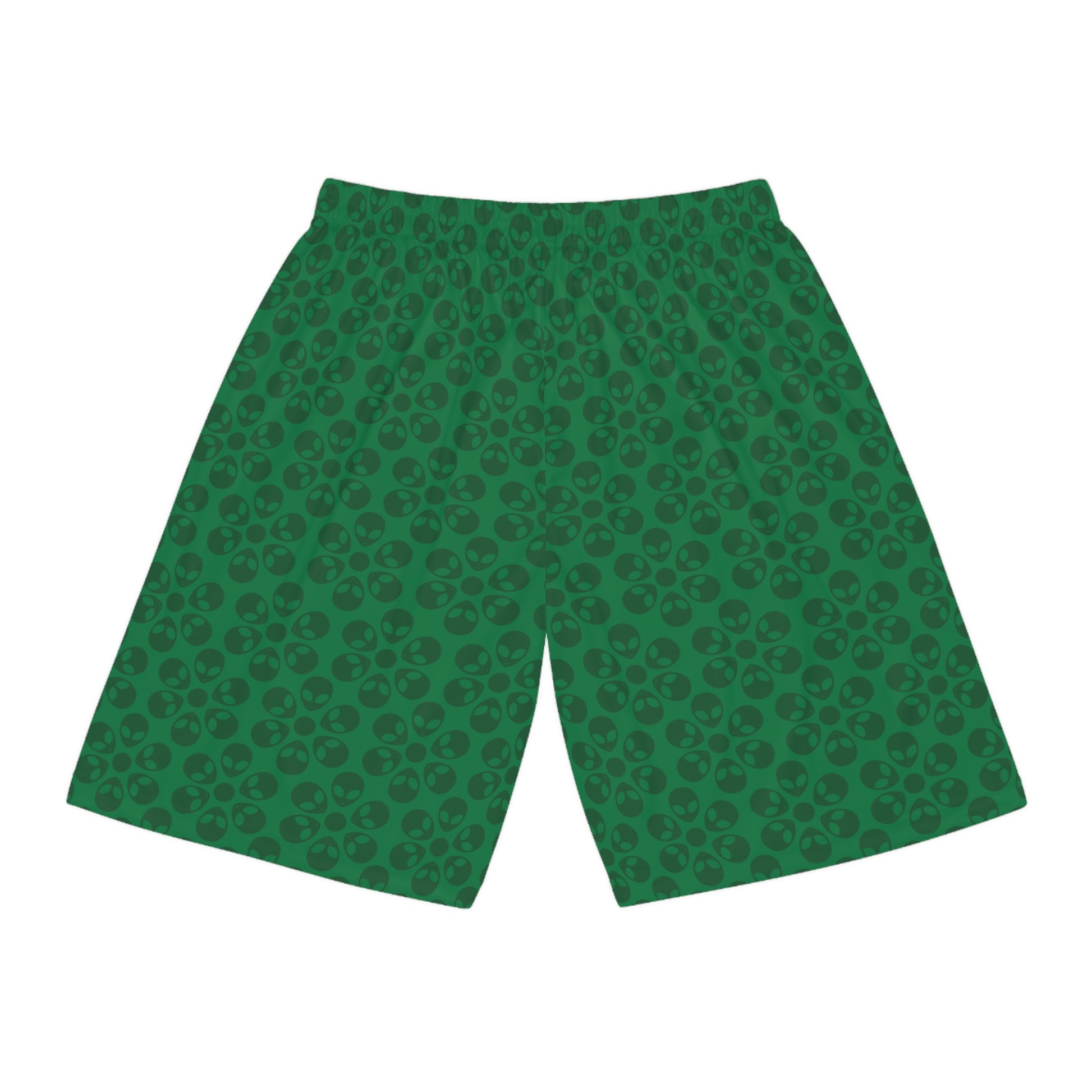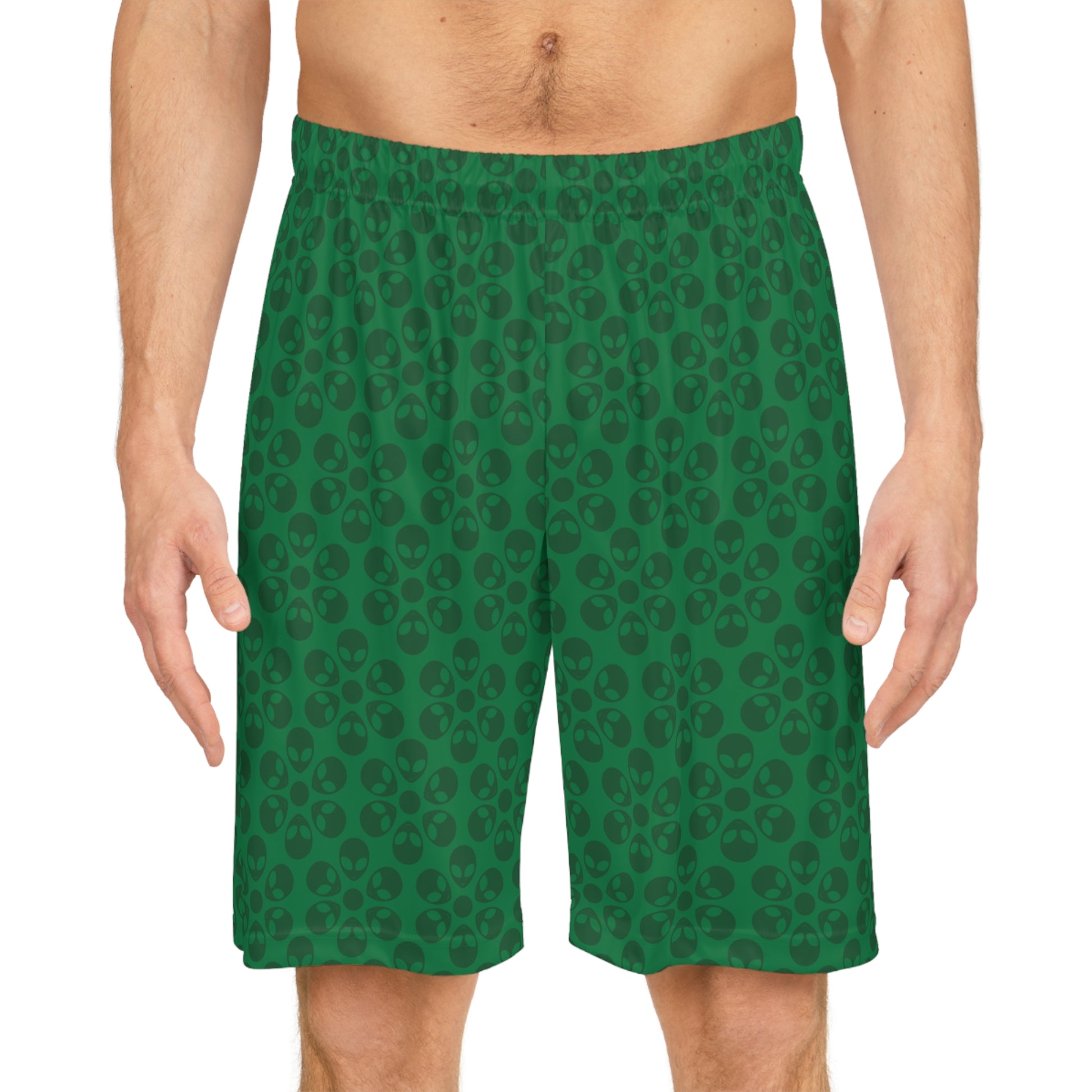 Trendy Skull Pattern Basketball Shorts Summer Activewear Sports Apparel Casual Wear Beach Shorts Gift for Basketball Lovers Alien Flowers Dark Green