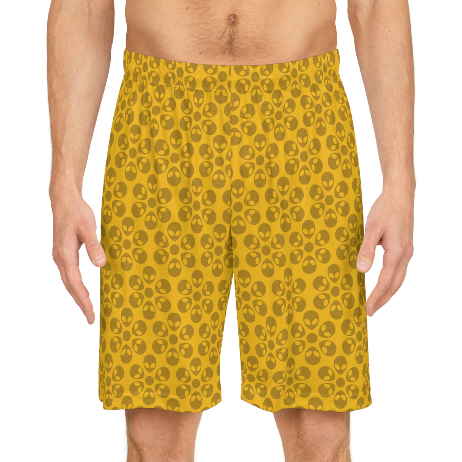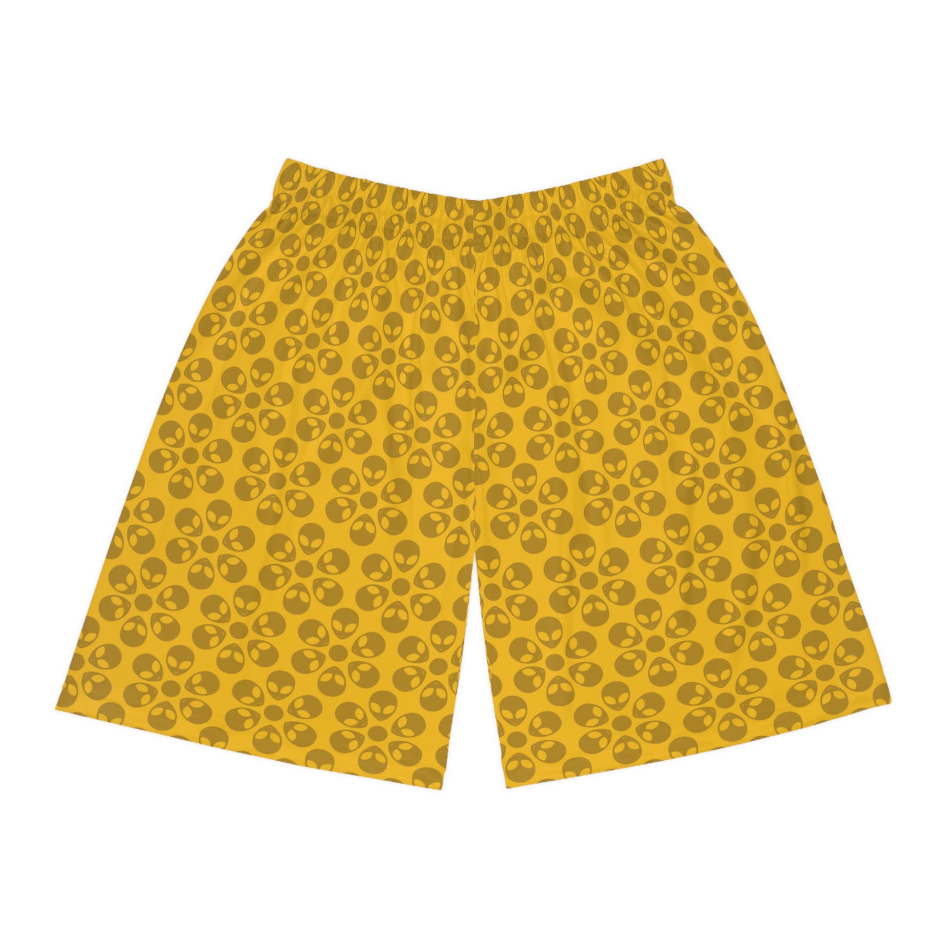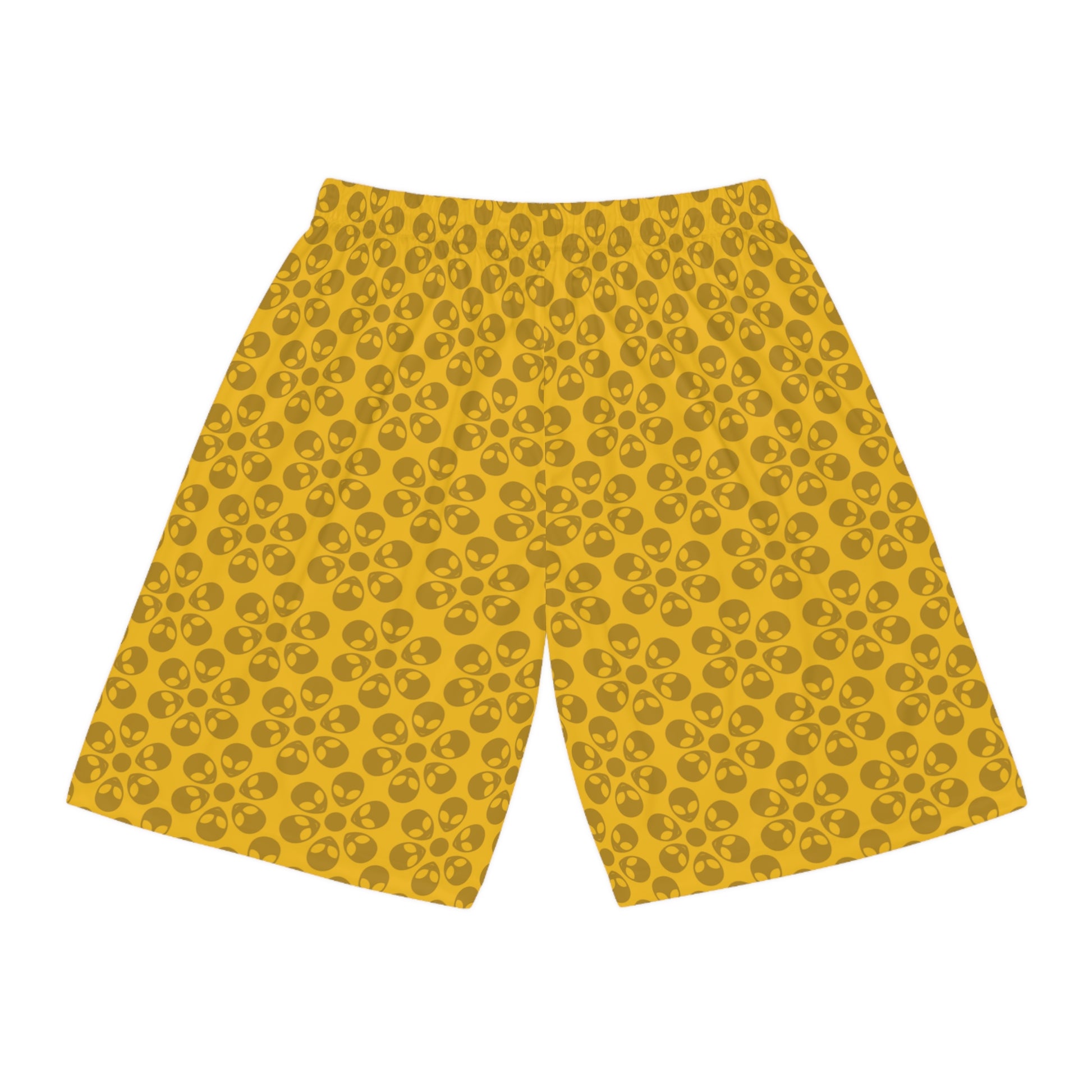 Trendy Skull Pattern Basketball Shorts Summer Activewear Sports Apparel Casual Wear Beach Shorts Gift for Basketball Lovers Alien Flowers Yellow