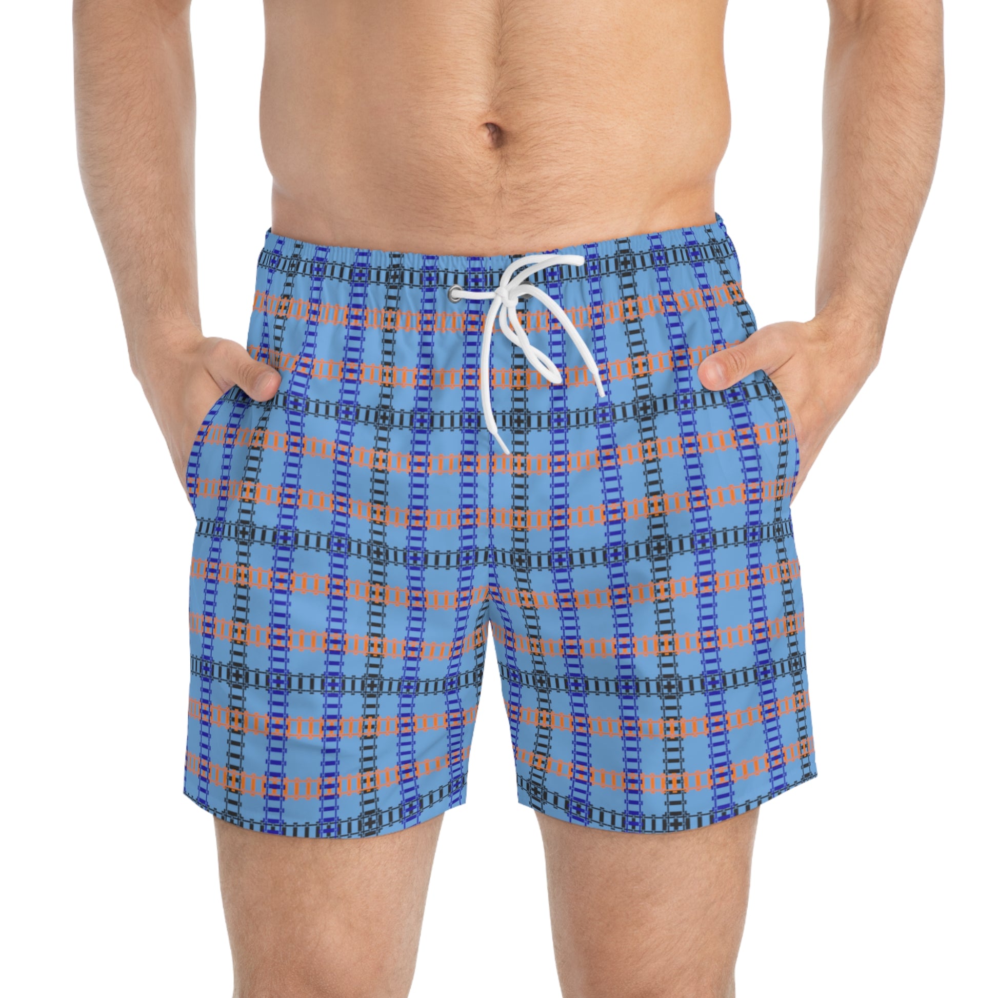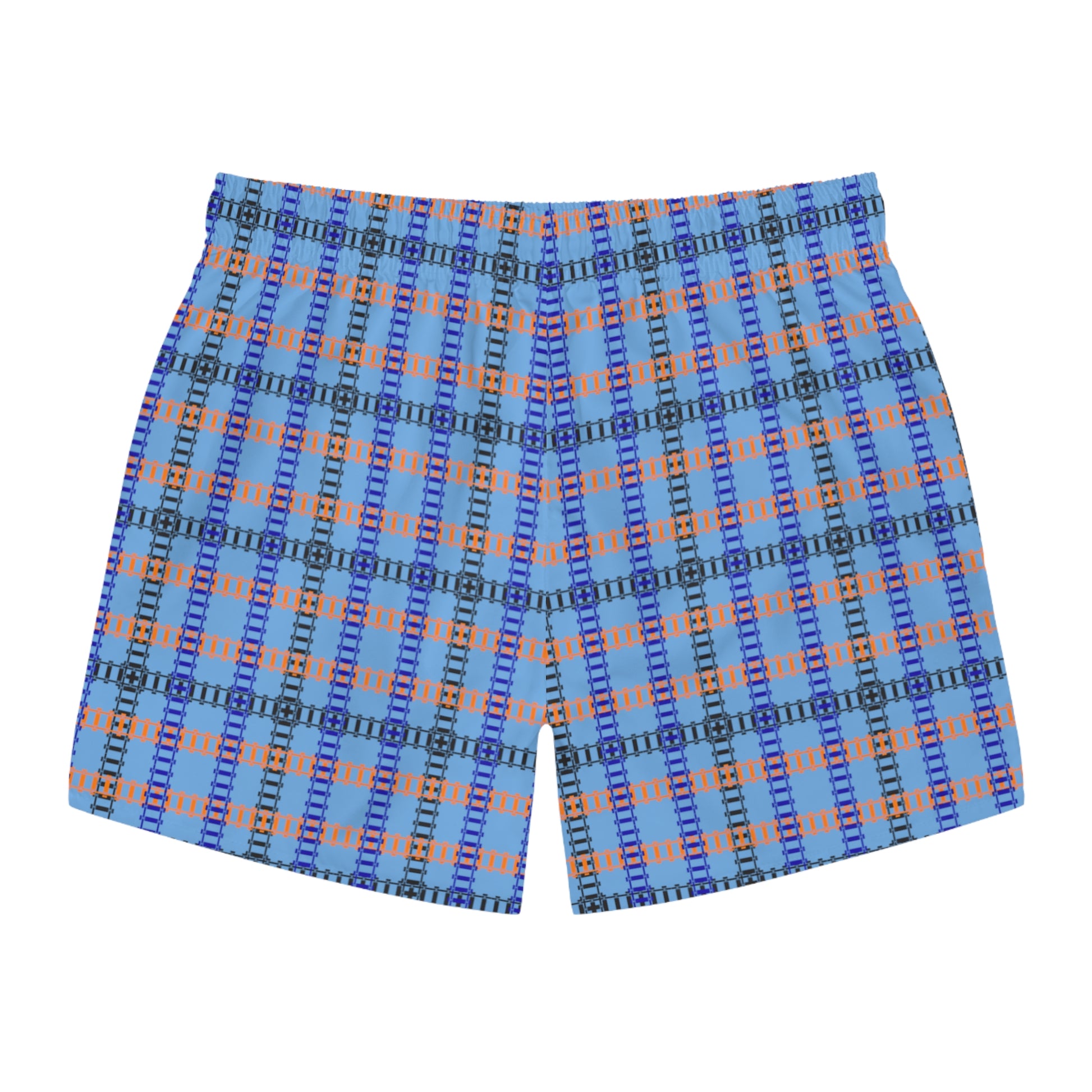 Vibrant Checkered Swim Trunks Beachwear for Summer Fun Vacation Essential Pool Party MustHave Mens Swim Shorts Train Tracks Light Blue