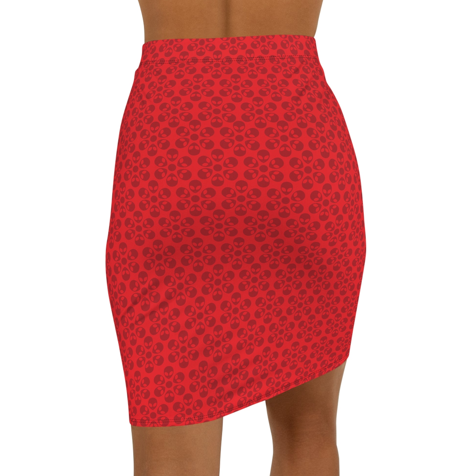 Womens MidWaist Pencil Skirt Alien Flowers Red