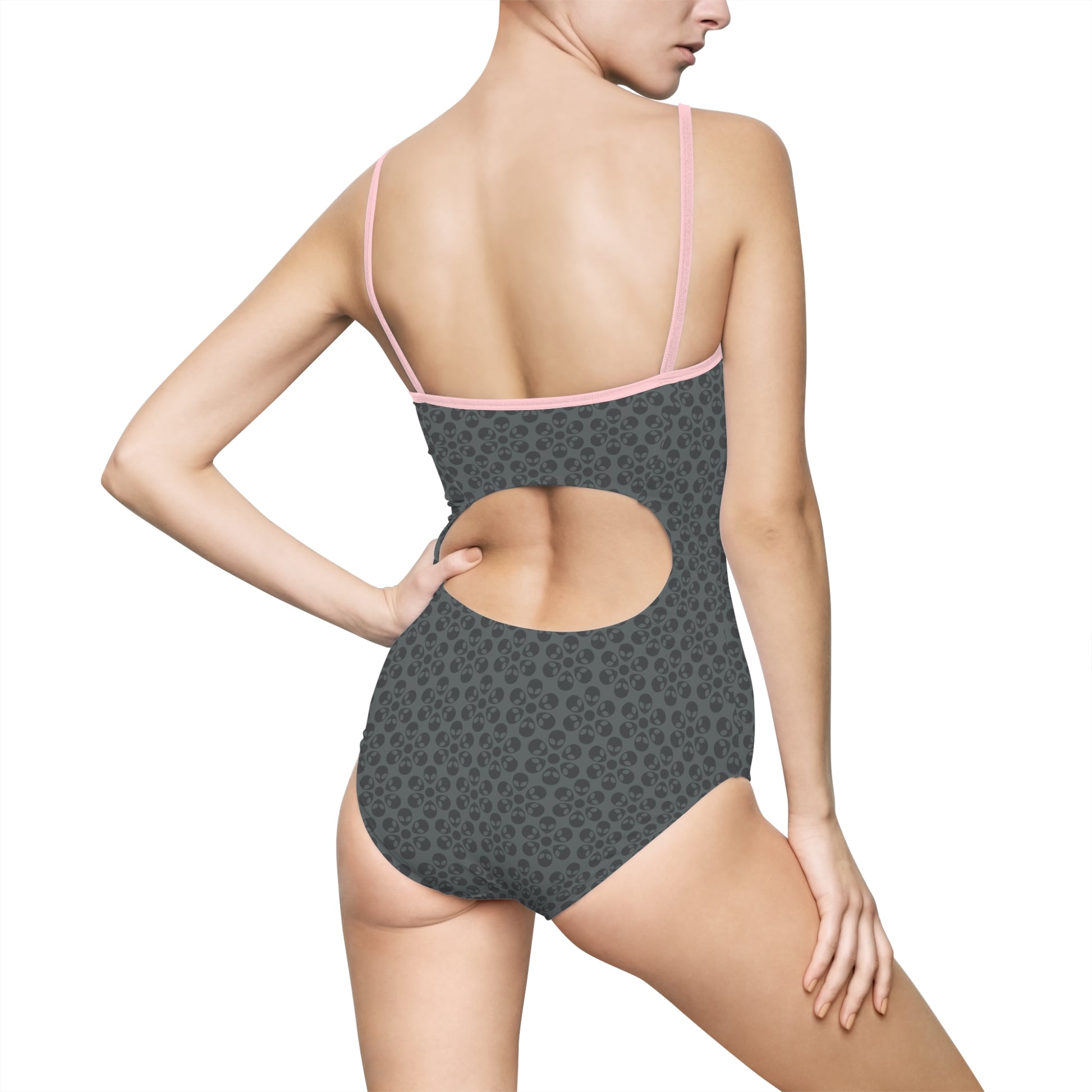 Womens Onepiece Swimsuit Alien Flowers Dark Grey