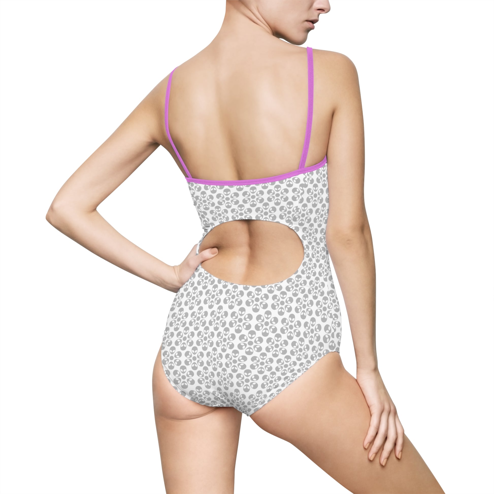 The one-piece swimsuit is designed for fashion-conscious swimmers. It features a hollowed-out backing. The fabric construction is 85% polyester and 15% spandex. This combination is ideal for displaying the vivid colors of a printed design. There is an elastic component near the chest area. This is designed for extra support.