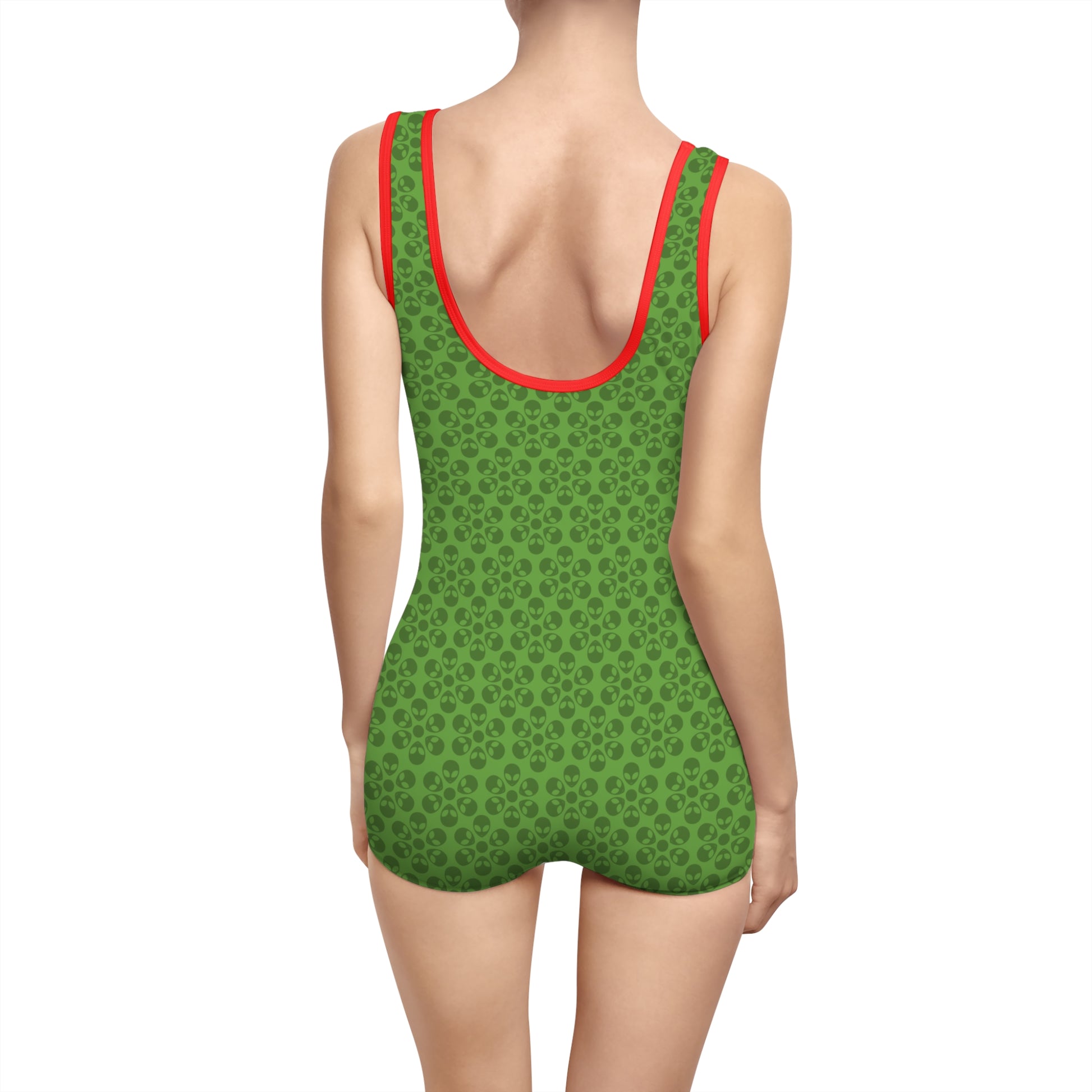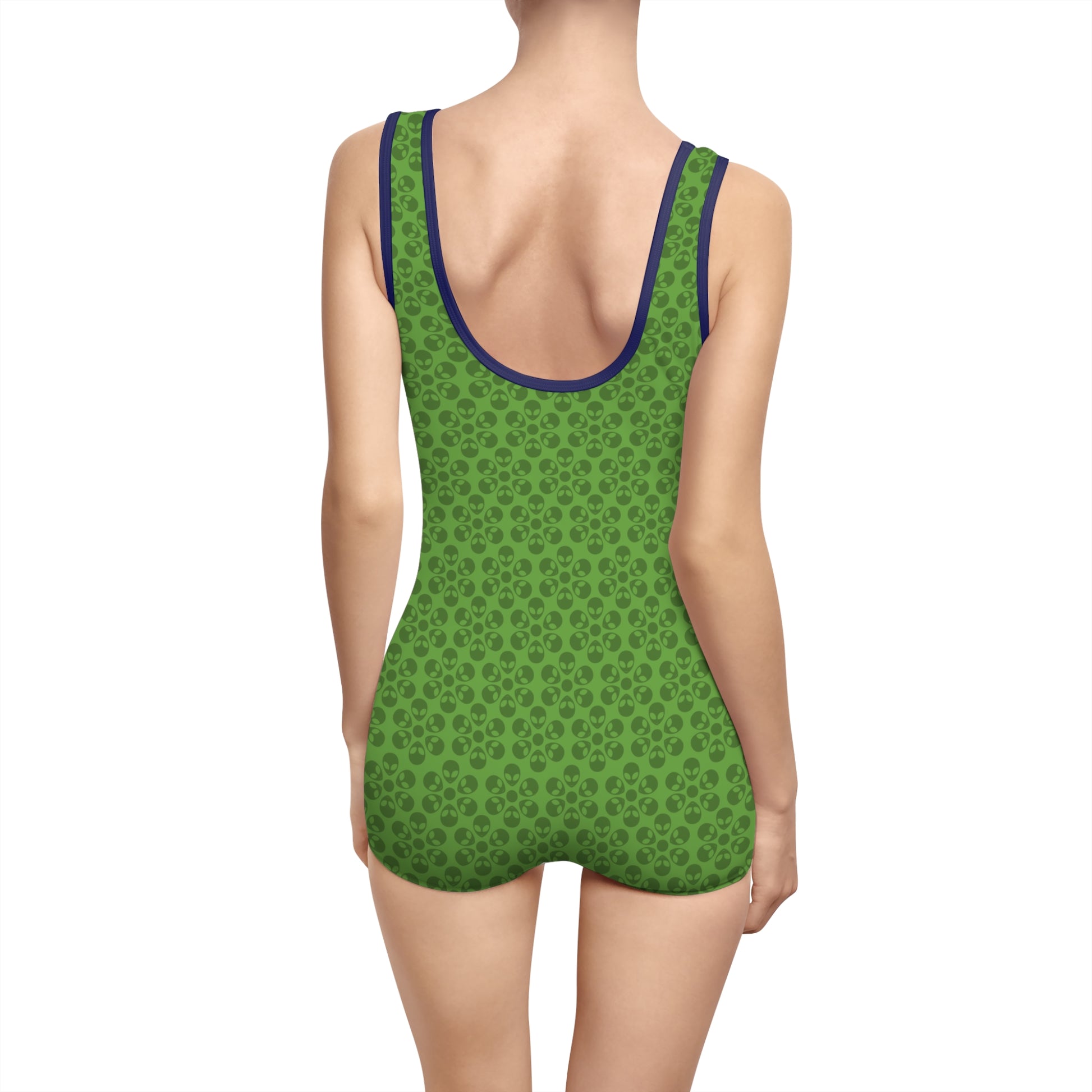 This one-piece swimsuit is designed for confident women in a vintage style. Customize it with your design to make it truly your own. Because of an advanced heat sublimation technique, it will not fade in the water or sun.